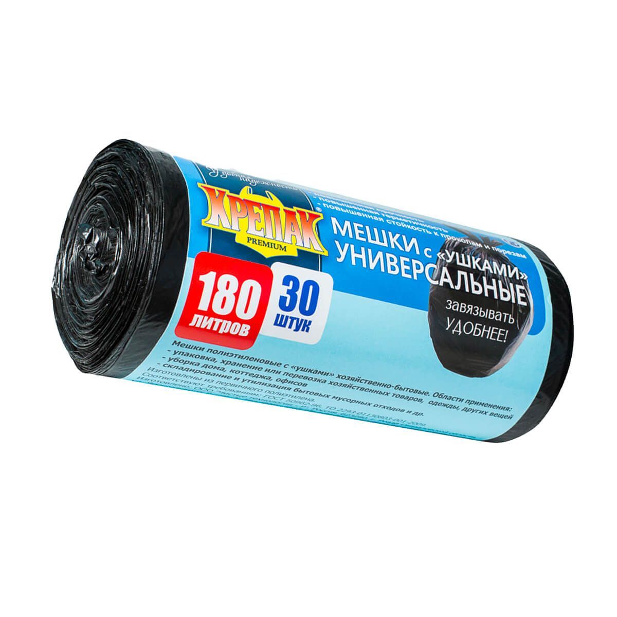 Мешки для мусора 180 л, с ушками, черные, в рулоне 30 шт., ПНД, 20 мкм, 1150х800 мм, Крепак, 4607075710399