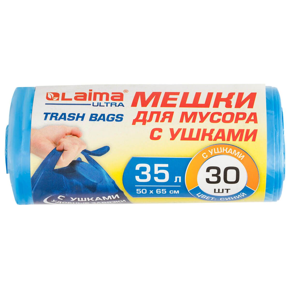 Мешки для мусора 35 л, с ушками, синие, в рулоне 30 шт., ПНД, 11 мкм, 650х500 мм, LAIMA ULTRA, 607684